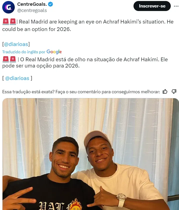 O Real Madrid só vai contrata Hakimi sem custos. Segundo o Defensa Central, o clube merengue não quer negociar diretamente com o PSG e vai esperar o ano de 2026 por um negócio.
