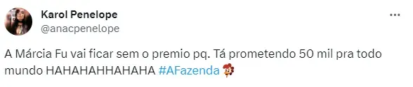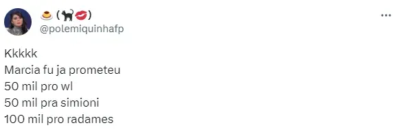Cariúcha, que estava próxima de ambas e ouviu a conversa, também brincou ao pedir o valor: “E para mim? Me faz um Pix também, Márcia! A Simioni não precisa, ela já é rica! Eu que preciso, estou sendo processada”.