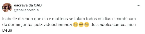 Por fim, Isabelle refletiu sobre o início de Mabelle: “A gente era adversário de princípio, ele me colocou no Paredão depois de me beijar. […] A gente não tinha essa noção, porque tudo era muito natural para a gente”.
