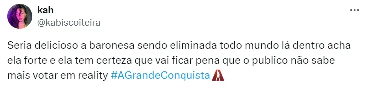 “Fez o Power Couple, A Fazenda, tentou subir [para o elenco definitivo] pelo Paiol… Vamos uma chance para a Baronesa, ver se ela consegue mostrar mais”, prosseguiu a influencer.