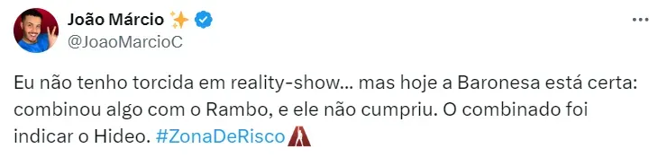 Dieguinho Schueng, por outro lado, revelou torcer por Cardoso: “Gostaria que o Bruno escapasse porque senti nele uma vibe caótica. Já o Rambo tinha que ficar para ser eliminado”.
