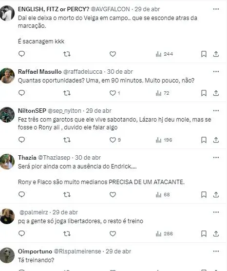 O comandante está atento a tal demanda palestrina, tanto, que Endrick foi substituído, justamente para que o técnico pudesse procurar outros caminhos. Abel, inclusive, brincou com o jogador, ao falar que o camisa 9 é um “fominha simpático”.