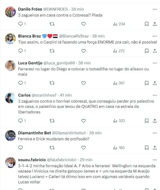 “Para jogo decisivo, Carpini pode fazer uma mudança tática para o jogo contra o Cobresal. É provável que o treinador opte por um 3-5-2, com o trio Luciano, James e Calleri mais à frente“, disse o jornalista em seu canal no Youtube.