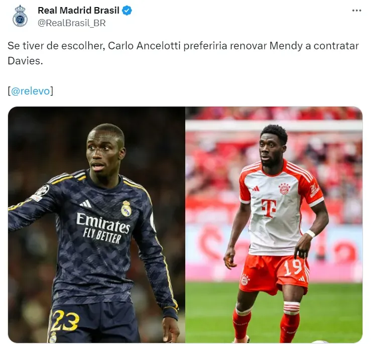 De acordo com informação do jornal Relevo, Ancelotti prefere que o Real Madrid renove o contrato de Mendy em relação a contratação de Davies. Para o que ele pensa de futebol, o lateral francês se encaixa melhor