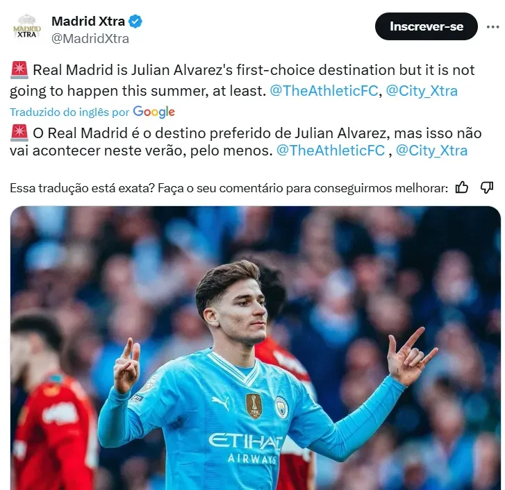 O argentino Julian Álvarez é um desses atletas que sonham em vestir as cores do Real Madrid. Reserva de Haaland, na Inglaterra, ele está interessado em uma mudança para o clube de Madri, mas isso não irá acontecer neste verão.