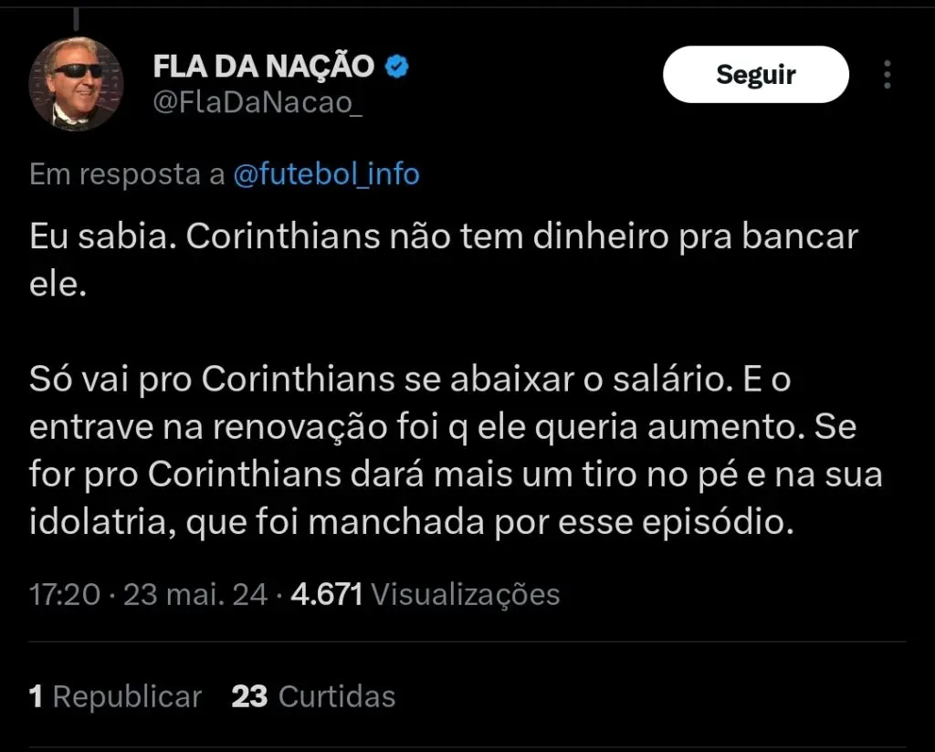 “Vieram perguntar isso sobre a camisa, mas ele declarou que coleciona. Que ele torce para o Corinthians todos sabem, mas defende o Flamengo. Não fomos atrás e não existe nada agora. Antes sabíamos das dificuldades e nunca prometi. Gostaria muito, disse que tem a cara do Corinthians e ponto. Depois disso, nunca mais, não falamos nada, tudo em paz e segue o jogo“, disse o dirigente durante um podcast.
