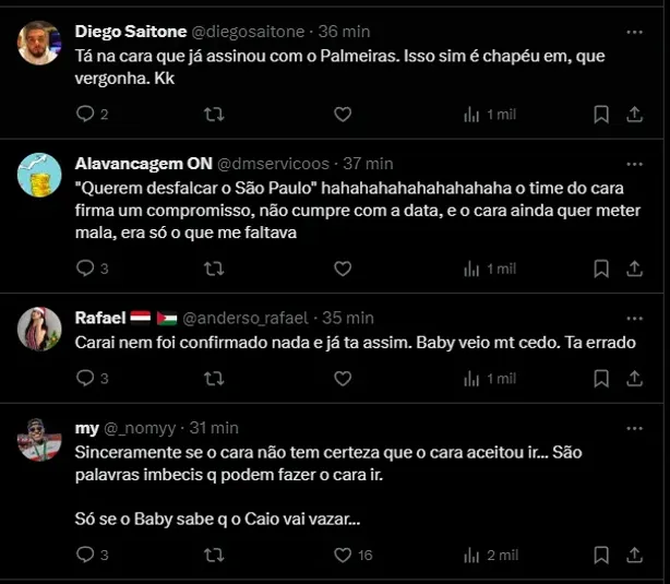 Em sua publicação, Baby também alerta a diretoria para o próximo ano do São Paulo: “Vamos acordar que Supercopa é logo ali. Copa do Brasil já passou, eliminamos a porcada mas depois brincamos no Brasileiro. Não dá mais para ser vacilão que 2024 a chapa é muito mais quente. Justifique o salário sem moscar“.