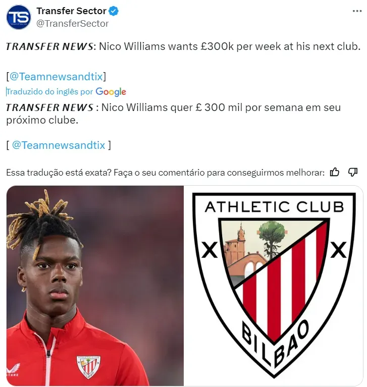 O jovem Nico Williams, do Bilbao, estaria aberto em ingressar ao Barcelona na próxima temporada. O clube catalão também tem interesse na contratação do atacante. Xavi é quem teria o desejo de tê-lo no elenco.