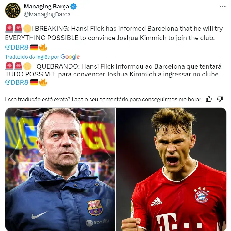 A carta na manga do Barcelona para convencer Kimmich a jogar na Espanha passa exclusivamente por Hansi Flick: é ele que tentará convencer o jogador a ingressar no novo destino, conforme informações do periodista David Bernabeu Reverter, do jornal Sport.