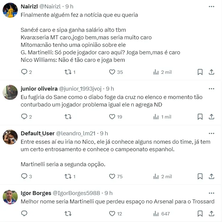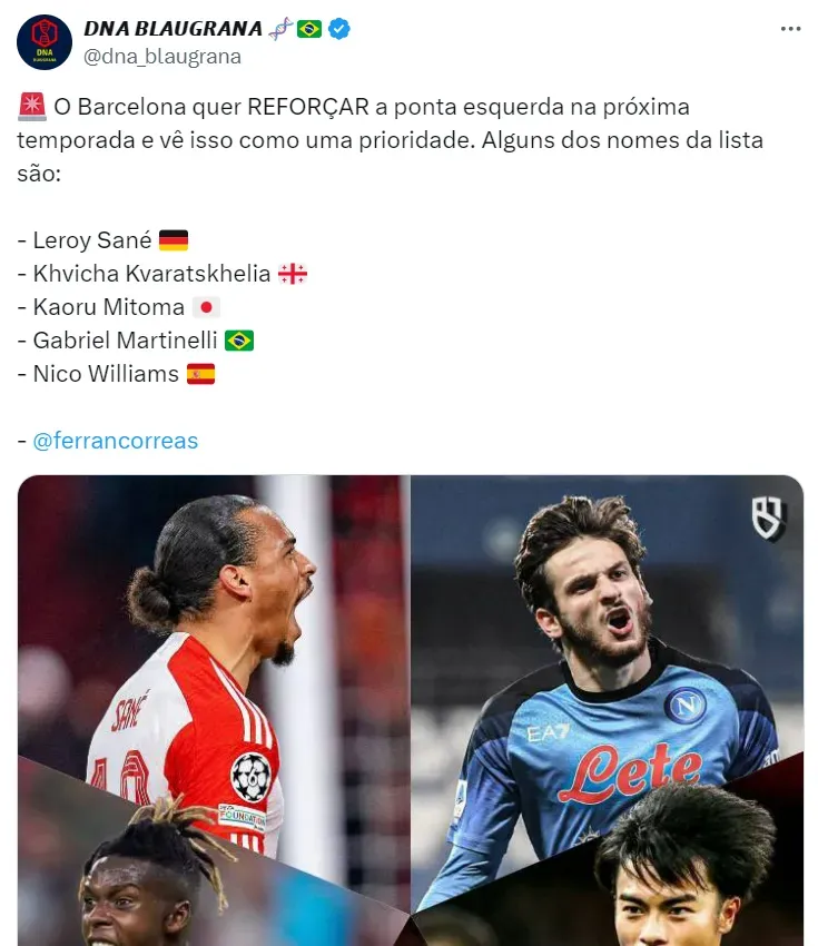 Os outros três alvos da diretoria no mercado são: Sané, do Bayern de Munique, Nico Williams, do Bilbao, e Kvaratskhelia, do Napoli, que pode deixar Nápoles, após recusar as primeiras abordagens por uma renovação.