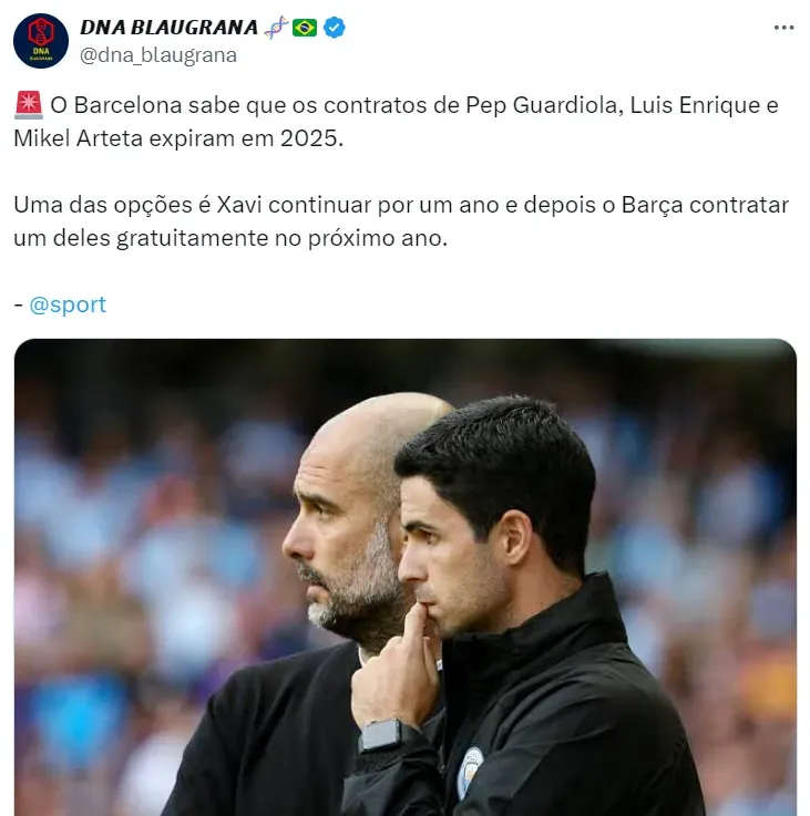 O plano da diretoria do Barça, segundo o jornal Sport, seria manter Xavi por pelo menos mais uma temporada e, no final dela, entender mais sobre Luis Enrique, do PSG, Arteta, do Arsenal, e o grande sonho, Guardiola, do City.