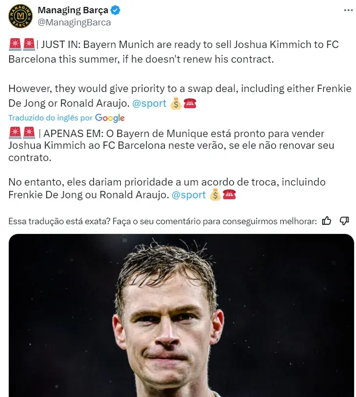 Segundo informações do jornal Sport, o Bayern estaria aberto a vender Kimmich para o Barça, mas prioriza uma troca de atletas com o clube espanhol envolvendo De Jong ou Ronald Araújo.