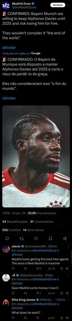 “Confirmado que o Bayern de Munique está disposto a manter Alphonso Davies até 2025 e corre o risco de perdê-lo de graça. Eles não consideram isso o fim do mundo”, destaca a publicação desta sexta-feira (14).