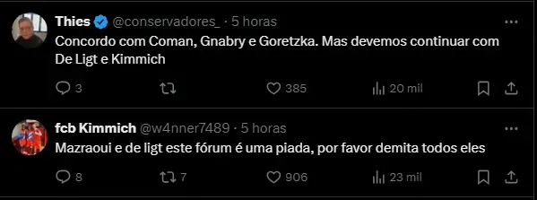 Segundo o jornalista Florian Plettenberg, Kingsley Coman, Serge Gnabry, Leon Goretzka, Joshua Kimmich, Noussair Mazraoui e Matthijs De Ligt podem ser negociados em caso de boas propostas.