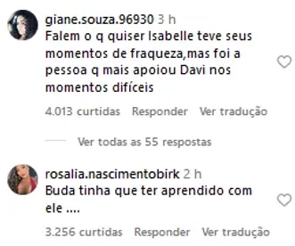 No entanto, a namorada do motorista de aplicativo nunca demonstrou ter nenhum tipo de incômodo sobre a relação de amizade que Davi e Isabelle criaram no reality show.