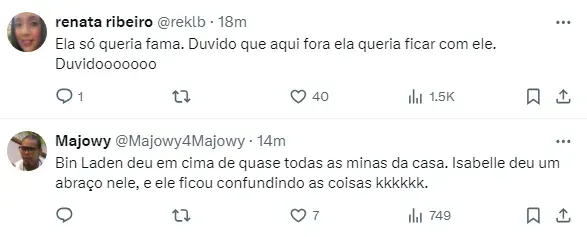 “Ele [Bin Laden] falou que às vezes olha para mim e tem desejo, e queria ficar de novo e tal”, declarou a mineira. “Você não tem vontade também, não?”, questionou Raquele.