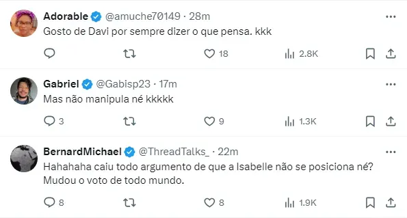 Pouco tempo antes, Davi abriu o jogo dos Fadas para Isabelle: colocaram como nomes para a votação em Leidy Elin, Bin e Raquele. No entanto, a manauara demonstrou que não seguirá o combinado do grupo.