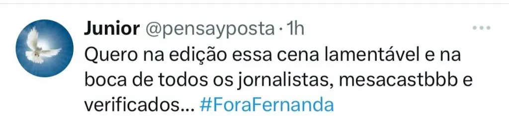 “Não é possível que vim só para isso, para bater palma para palhaço. Não vim bater palma pra palhaço. Comprometimento de c* é uma rol* bem grossa, sai fora! ‘É um jogo de comprometimento’, ah vá bater continência na casa do caralh*!”.Pitel: “Talvez esse jogo de comprometimento levou ele aos 3 milhões!”. Fernanda: “Ah, vá arrumar um emprego de segurança num prédio, não fod*!”.