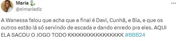 Ela segue com seu pensamento e monta o suposto pódio do baiano: “Ele acha e põe a Beatriz e a Cunhã (Isabelle) com ele. Ele tem certeza de que a final é essa”. Vale lembrar que a amizade de Isabelle e o brother vem causando polêmica fora da casa.