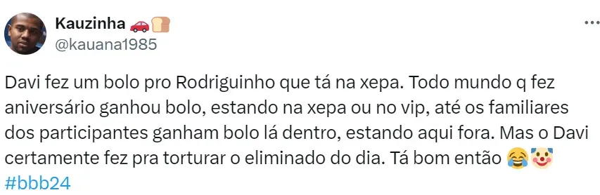 Vale lembrar que de acordo com as regras do BBB 24, o cantor não poderia comer o bolo porque ele está na Xepa. Se fizesse isso, ele seria penalizado.