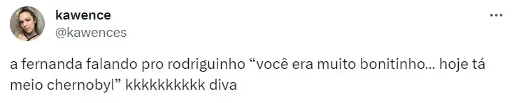 “Eu acho o corpo dela meio estranho, tá ligado”, respondeu Nizam. Quem também estava no quarto era Vinicius, que não corrigiu nenhum dos amigos: “Ela tá mais velha e largou mão”, finalizou Rodriguinho.
