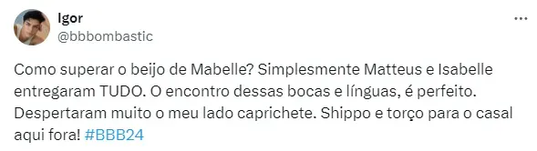 Em meio a troca de carinhos com o gaúcho, a manauara questionou se eles irão se encontrar após o fim do reality global. “Se você quiser, eu quero”, disse Matteus. “Mas será? Uma vez a Alane me perguntou sobre isso e conversei com ela. Será que a gente vai se encontrar fora daqui?”, refletiu Isabelle.
