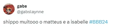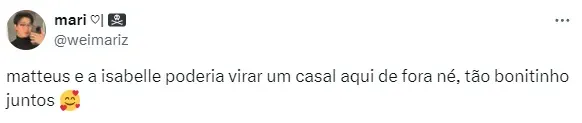 Em meio a troca de carinhos com o gaúcho, a manauara questionou se eles irão se encontrar após o fim do reality global. “Se você quiser, eu quero”, disse Matteus. “Mas será? Uma vez a Alane me perguntou sobre isso e conversei com ela. Será que a gente vai se encontrar fora daqui?”, refletiu Isabelle.