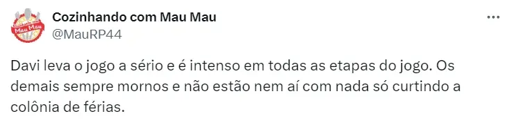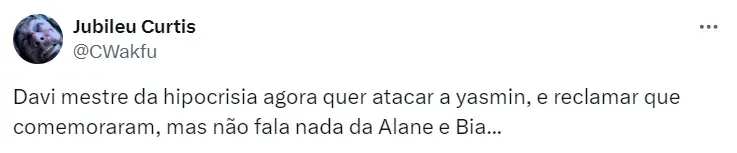 Além de criticar Yasmin, o baiano também falou mal dos alimentos fornecidos pela direção: arroz, óleo, feijão e goiabada. Para muitos, Davi foi contraditório e hipócrita, já que vem de origem humilde.
