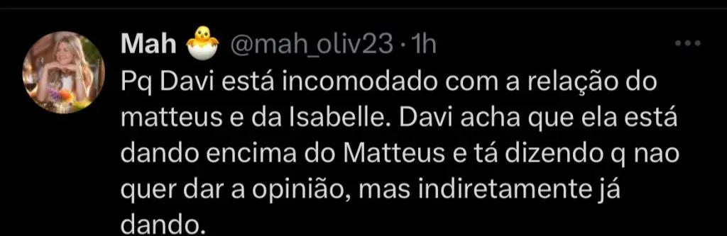 Davi imediatamente respondeu que não queria se intrometer: “Tem como vocês me tirar desse assunto?”, pediu o baiano. Isabelle mostrou estar triste e não pediu mais a opinião do aliado.