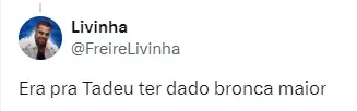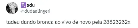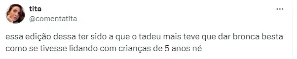 “Vocês não entenderam a parte de voltar em silêncio pro quarto?”, questionou Tadeu. “Ainda bem que vocês não falaram nada comprometedor, só saíram comemorando, aí tudo bem, não teve nada grave. Mas quando a gente pede silêncio, é pra voltar em silêncio para não atrapalhar a dinâmica, tá bom?”, completou.