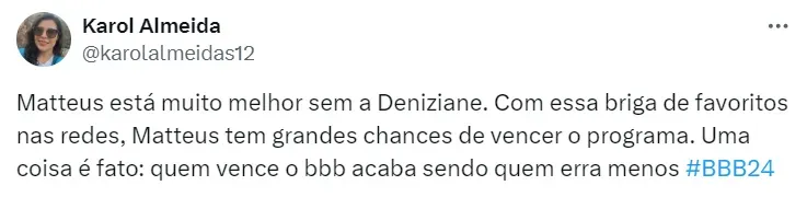 Pouco antes de ser eliminada, Deniziane colocou um ponto final no romance com Matteus. O brother, é claro, ficou desolado e precisou de um bom tempo para esquecer a fisioterapeuta.