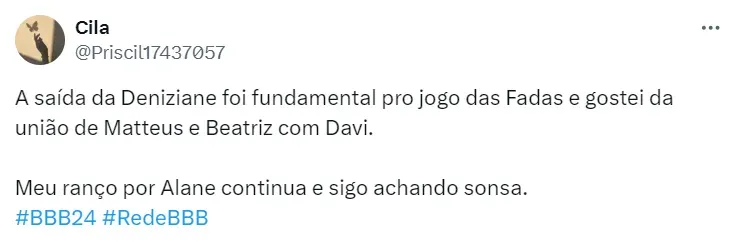 “Se fosse aqui fora, eu iria me entregar [referindo-se ao relacionamento com Matteus]. Ia viver aquilo ali sem a pressão do jogo. Porque eu fui bitolada para não me relacionar”, finalizou.