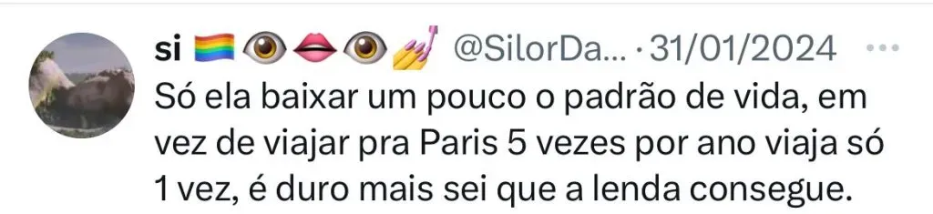 “Como ela tem uma carreira independente, eu acho que é nesse sentido. Quando ela parou para ir para o reality, os shows não continuaram. Ela precisava manter a equipe, isso é caro. Ela teve que pegar dinheiro emprestado de banco”, contou.