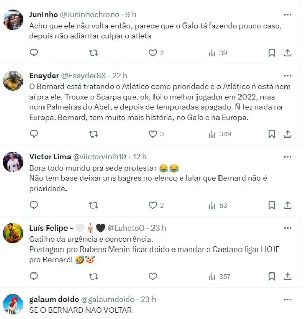 “Palmeiras, Vasco, Botafogo, Flamengo, São Paulo e mais 2 clubes europeus já fizeram consulta pelo Bernard, cujo contrato termina no meio do ano. Panathinaikos também quer a renovação. Ou o Galo trata a contratação como prioridade, ou continua pagando caro pra Vargas e Pedrinho”. escreveu Igor no X