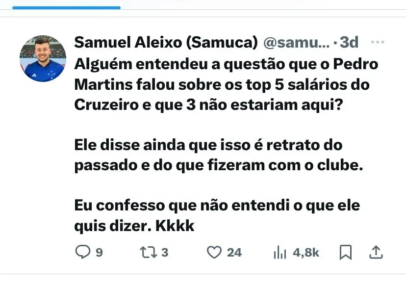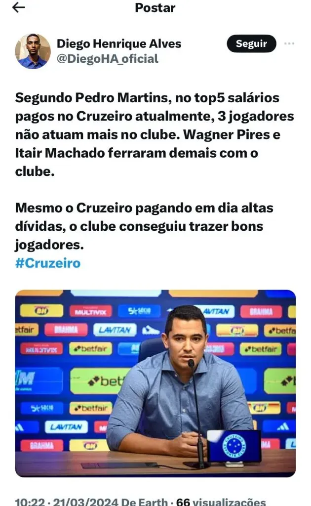 Em entrevista ao GE, o executivo de futebol cruzeirense, Pedro Martins revelou que grande parte da dívida atual do Clube são de contratos ligados ao passado, principalmente de jogadores que não estão no Clube.