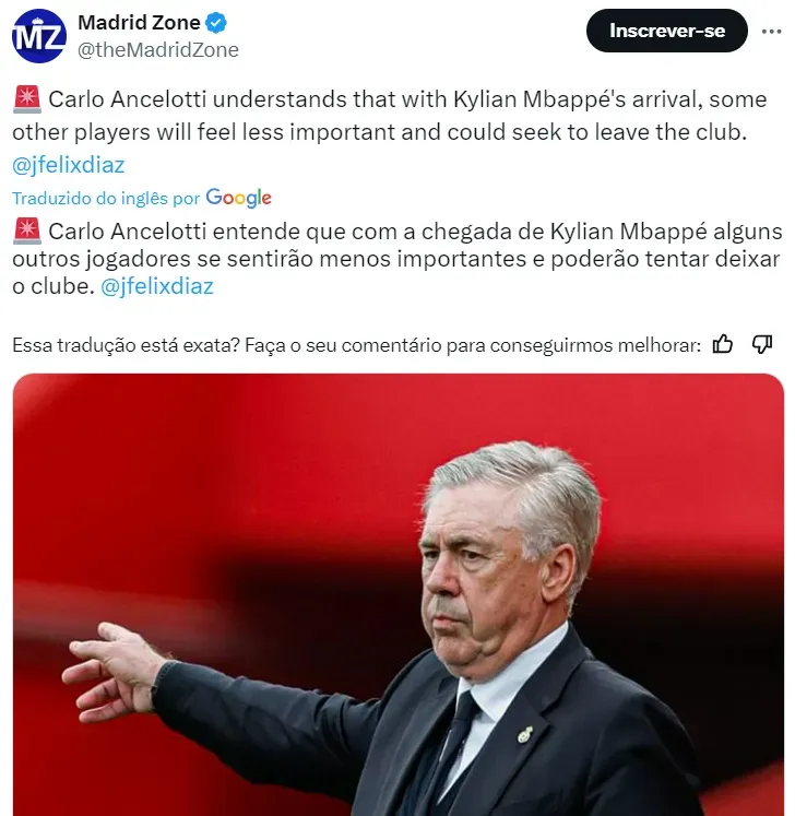 Ancelotti está ciente de possíveis baixas no Real Madrid devido ao fator Mbappé