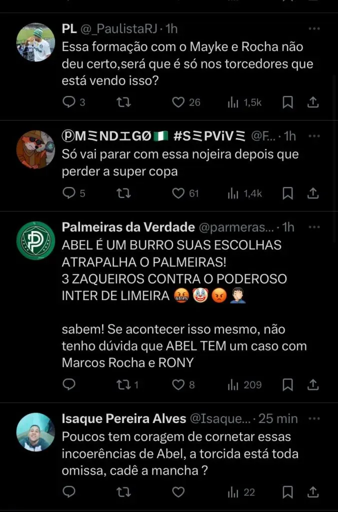 Além disso, Abel também testou com três jogadores no setor ofensivo: Luis Guilherme, Rony e Caio Paulista; Luis Guilherme, Flaco López e Bruno Rodrigues. Recém-contratado, Bruno Rodrigues pode ser titular.