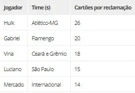 Jogadores que mais levaram cartões por reclamação