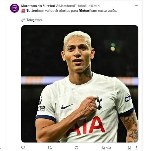 Segundo relatos do jornal inglês “Telegraph”, o Tottenham está aberto a ouvir propostas por Richarlison. Esta decisão vem após declarações do técnico Ange Postecoglou sobre a necessidade de mudanças no clube.