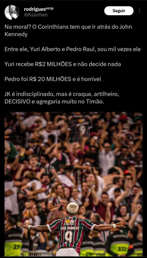 O setorista Iago Freire informa que o Corinthians estuda a possibilidade de avançar pela contratação de John Kennedy.