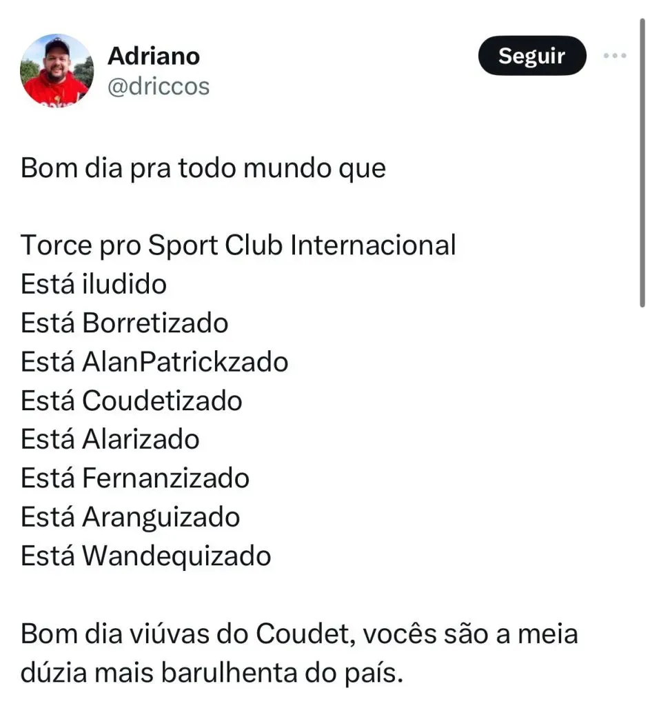 Por fim, Eduardo Coudet foi questionado sobre a montagem do elenco do Internacional. Na última janela de transferências, que se encerrou no último dia 7 de março, o Colorado trouxe 10 novos reforços e ainda procura um goleiro para substituir o goleiro Ivan.