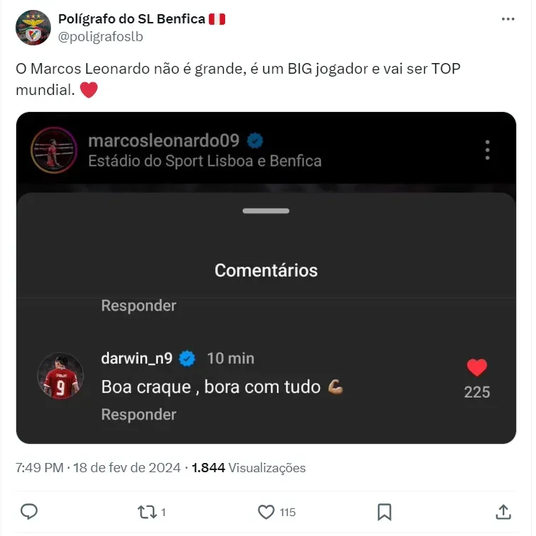 Isso porque, Darwin Nuñes, do Liverpool, deixou seu comentário na publicação se rendendo ao futebol do atleta. “Boa craque, bora com tudo”, escreveu. Vale destacar que outros grandes nomes do futebol também comentaram a publicação do centroavante.
