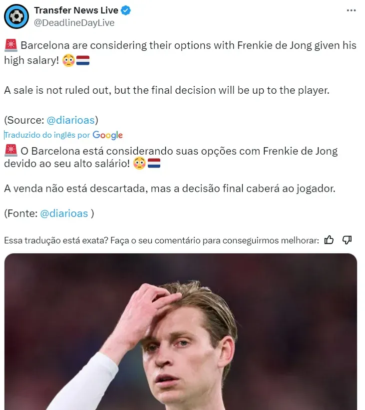 A diretoria espanhola espera também pela decisão de De Jong: em caso do meia aceitar diminuir seus pendência, as chances de ficar no Camp Nou irão crescer. Caso contrário, no entanto, uma saída deve acontecer.
