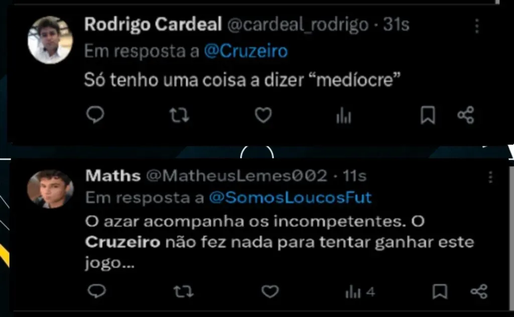 “Jogo mt ruim do Cruzeiro. Seabra novamente aceitando d+ as circunstâncias do jogo sem um mínimo de variação tática. Substituições sempre as mesmas, acreditando excessivamente em um esquema q me parece já estudado pelos adversários.”