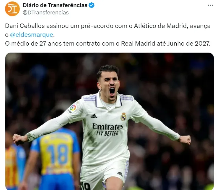 O espanhol Dani Ceballos será reforço do Atlético Madrid na próxima temporada. Dani está infeliz no Real Madrid e deixará o time de Carlo Ancelotti. A informação da saída do meio-campista é do portal espanhol El Desmarque.