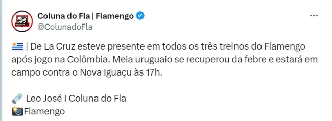 O jornalista Leo José informou que De La Cruz participou de todos os treinamentos após o jogo pela Libertadores. Com isso, os torcedores flamenguistas comemoram na web a notícia.