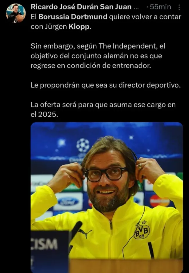 Isso porque, nesta quarta-feira, o portal The Independent, da Inglaterra, revelou que existe a possibilidade do treinador retornar ao Borussia Dortmund, mas como diretor esportivo.