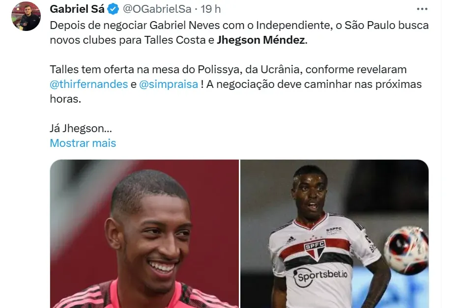 Sobre Talles, o FC Polissya, da Ucrânia, acertou a compra do volante de 21 anos por cerca de 1 milhão de euros (R$ 5,3 milhões na cotação atual). A cria de Cotia já viajou ao Leste Europeu para realizar exames.