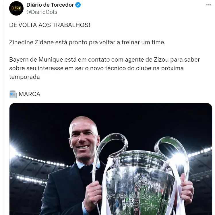 Três anos longe dos gramados, Zidane pode ser o mais novo treinador do Bayern de Munique no final da temporada. O francês recebeu o primeiro contato por parte do clube bávaro, informa o jornal Marca.