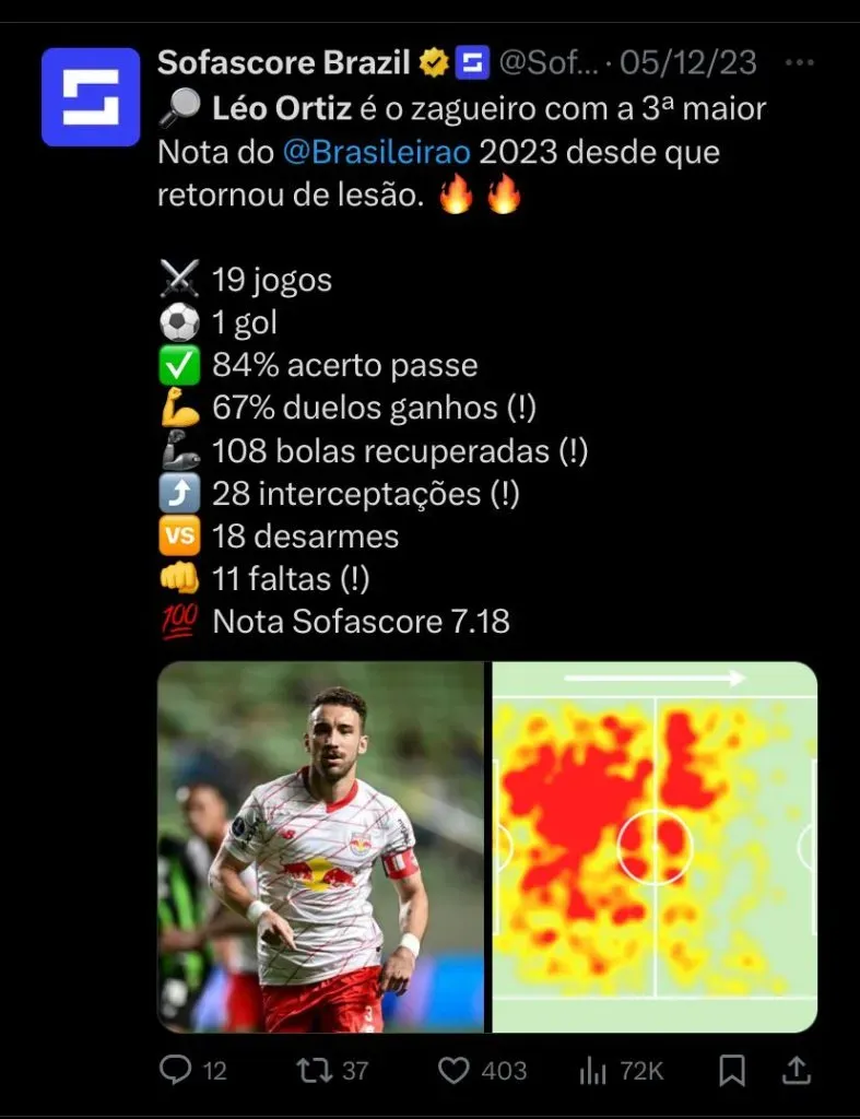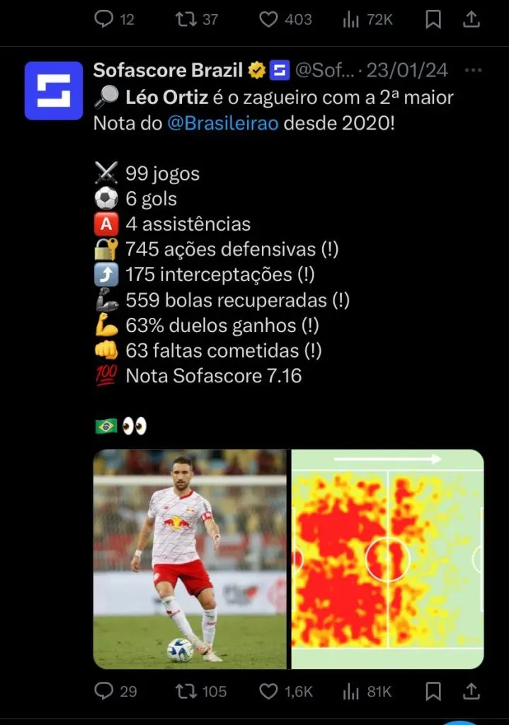 Os números do zagueiro em 2023 trazidos pelo SofaScore Brasil, mesmo após a lesão, mostravam que ele tinha a 3ª nota do Campeonato Brasileiro, com 84% de acerto nos passes e 67% duelos ganhos, algo que obviamente chamou a atenção do staff flamenguista.